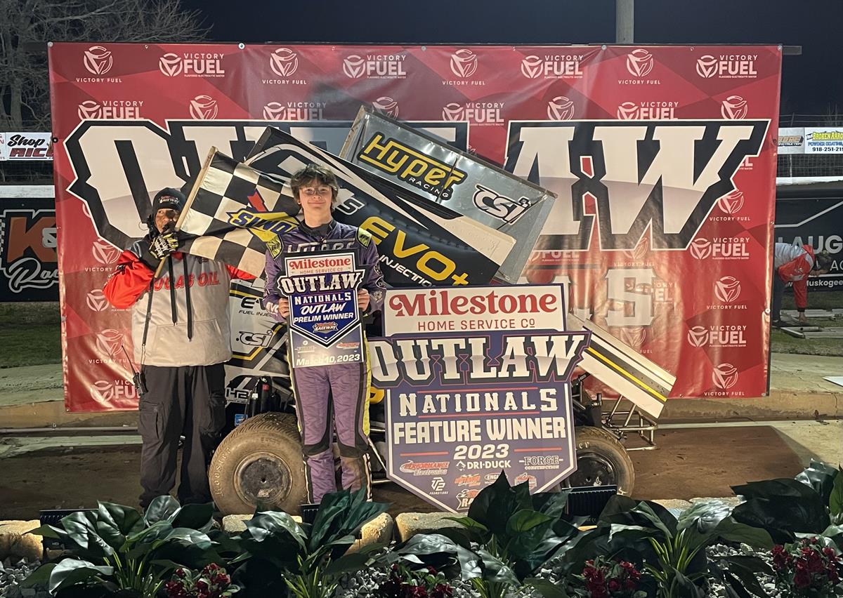 Bryan Hulbert – TULSA, Okla. (March 10, 2023) Putting a drive on the field Friday night, Steven Snyder, Jr. served notice with a run from 15th to win Friday’s Forge Construction Qualifying Night at the Milestone Home Service Co. Outlaw Nationals presented by T2 Promotions with the Dirt2Media National Open Wheel 600 Series presented by Hi-Plains Building Division.