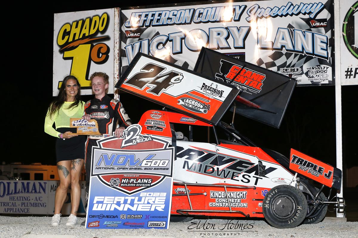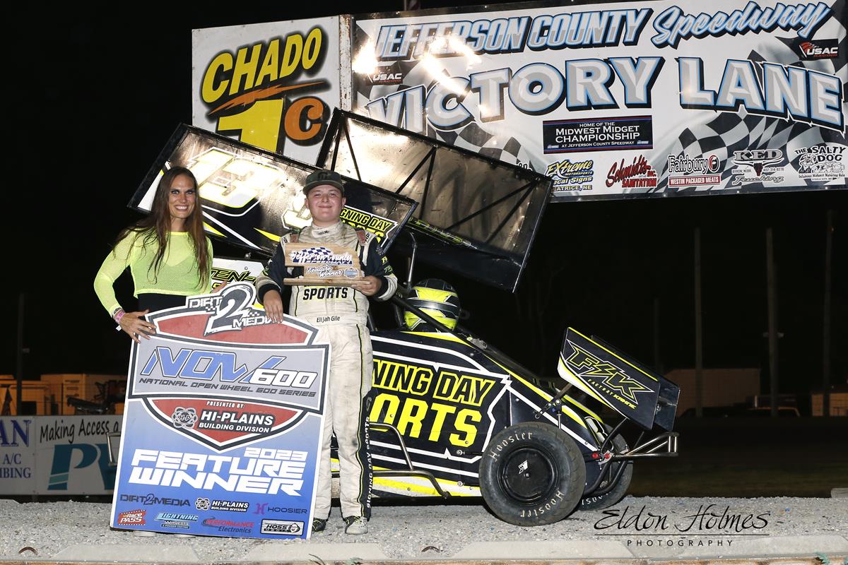 Bryan Hulbert – FAIRBURY, Neb. (August 19, 2023) Three drivers added their names to the list of winners with the Dirt2Media National Open Wheel 600 Series presented by Hi-Plains Building Division Saturday night at Jefferson County Speedway, as Elijah Gile, Gaige Weldon, and Cale Lagroon went to Victory Lane.
