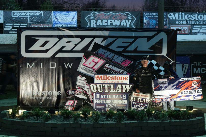 TULSA, Okla. (March 10, 2024) Capturing his first career victory with the Dirt2Media National Open Wheel 600 Series presented by Hi-Plains Building Division, Missouri’s Cole Tinsley pocketed $10,000 at the Milestone Home Service Co. Outlaw Nationals presented by Start2Finish TV, while Braxton Weger topped Restricted, with Lathan Knott winnig Junior Sprints.